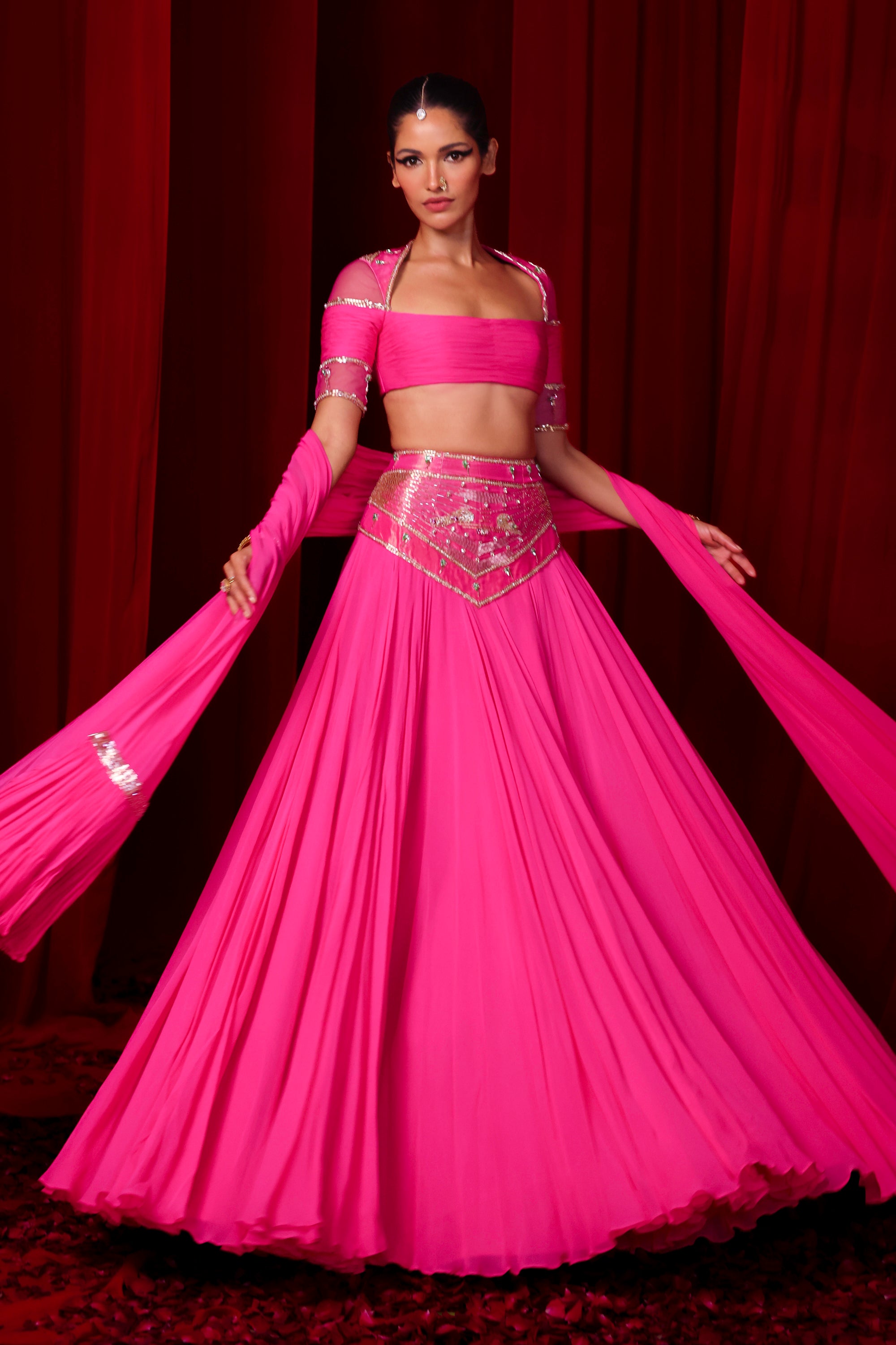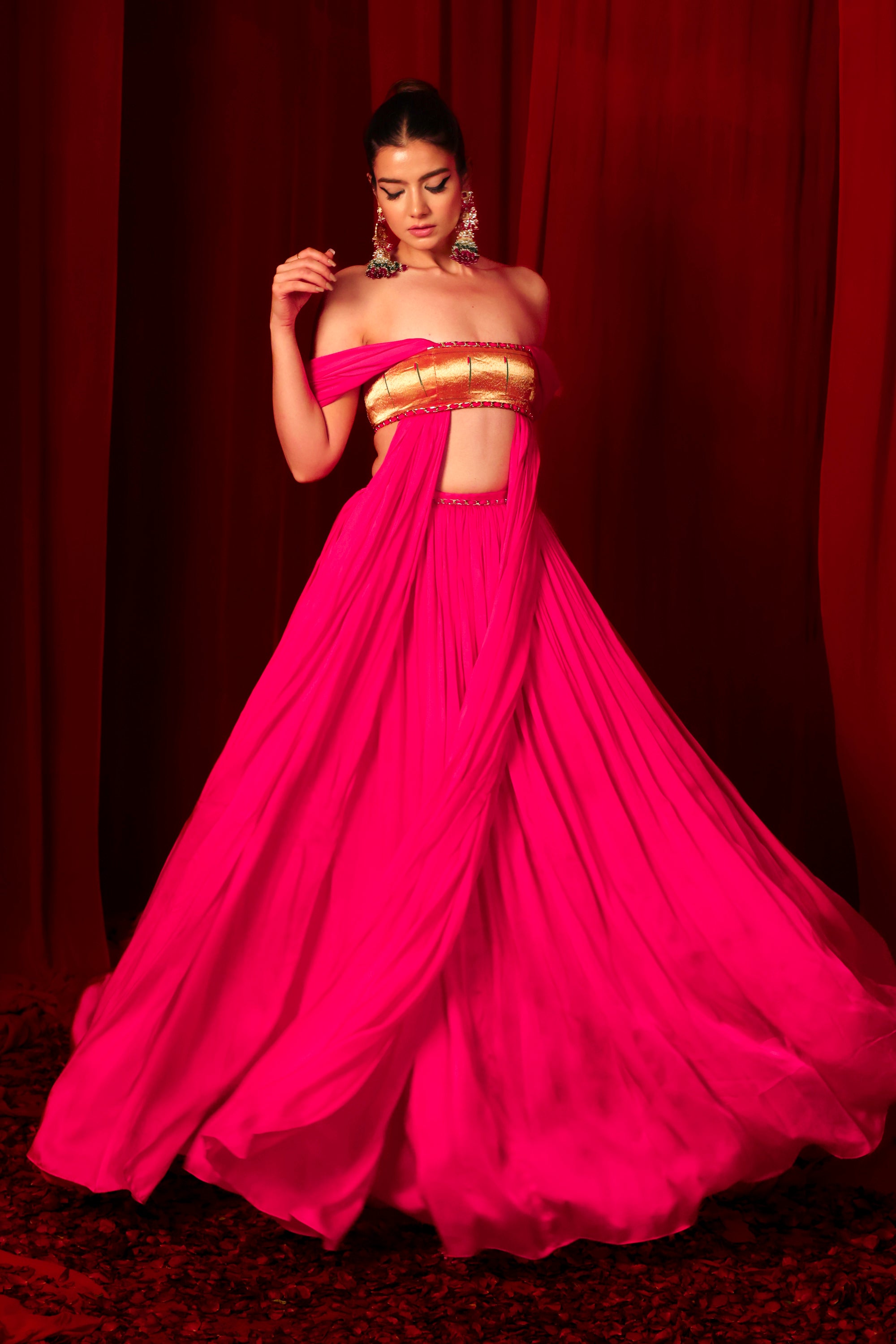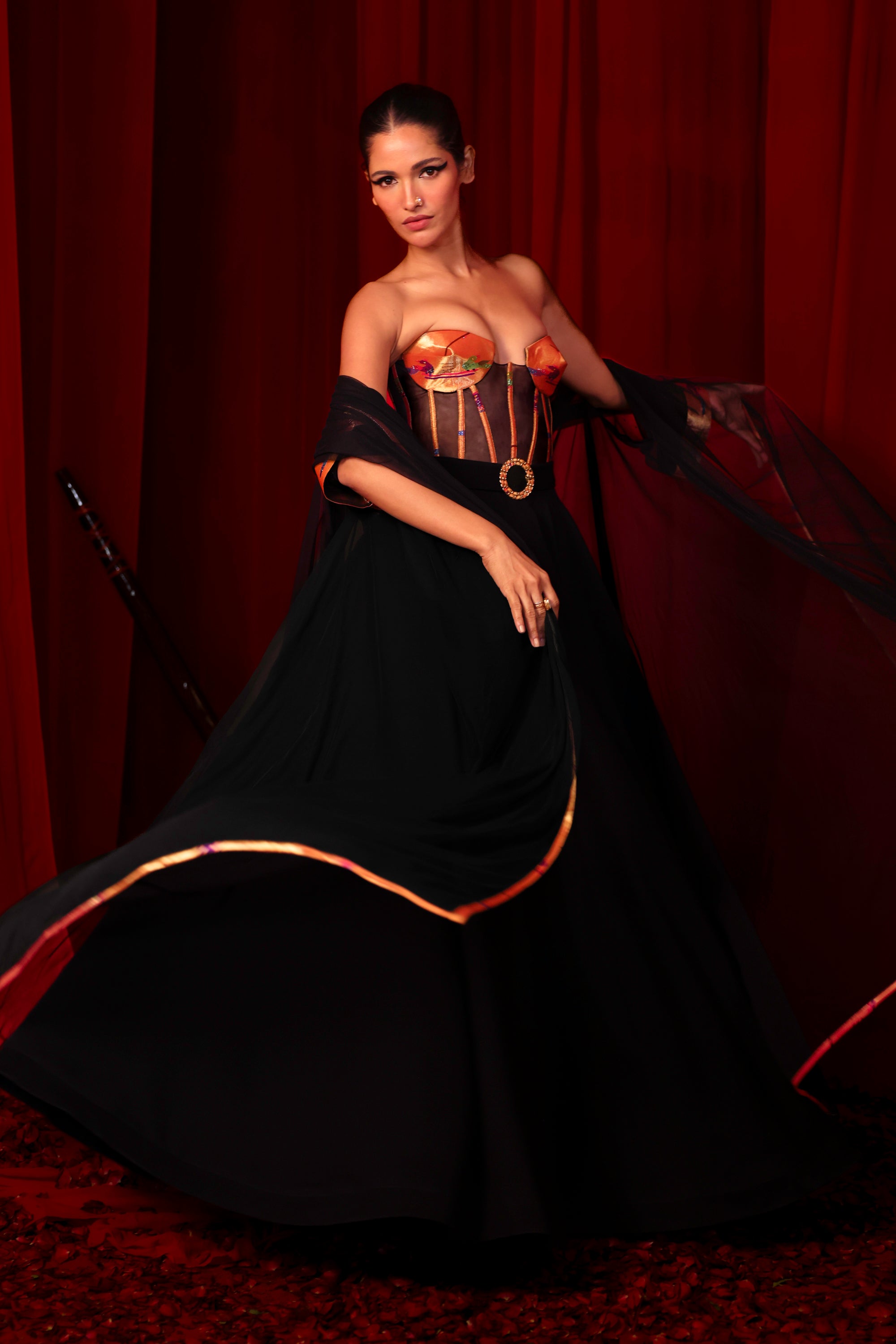 The collection features a striking palette of bold black, vibrant hot pink, passionate red, and deep blue. Emphasising corsetry and intricate draping techniques, each piece merges traditional craftsmanship with modern design, creating garments that resonate with both history and contemporary style.