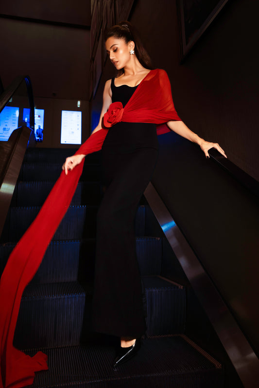 The collection features a striking palette of bold black, vibrant hot pink, passionate red, and deep blue. Emphasising corsetry and intricate draping techniques, each piece merges traditional craftsmanship with modern design, creating garments that resonate with both history and contemporary style.