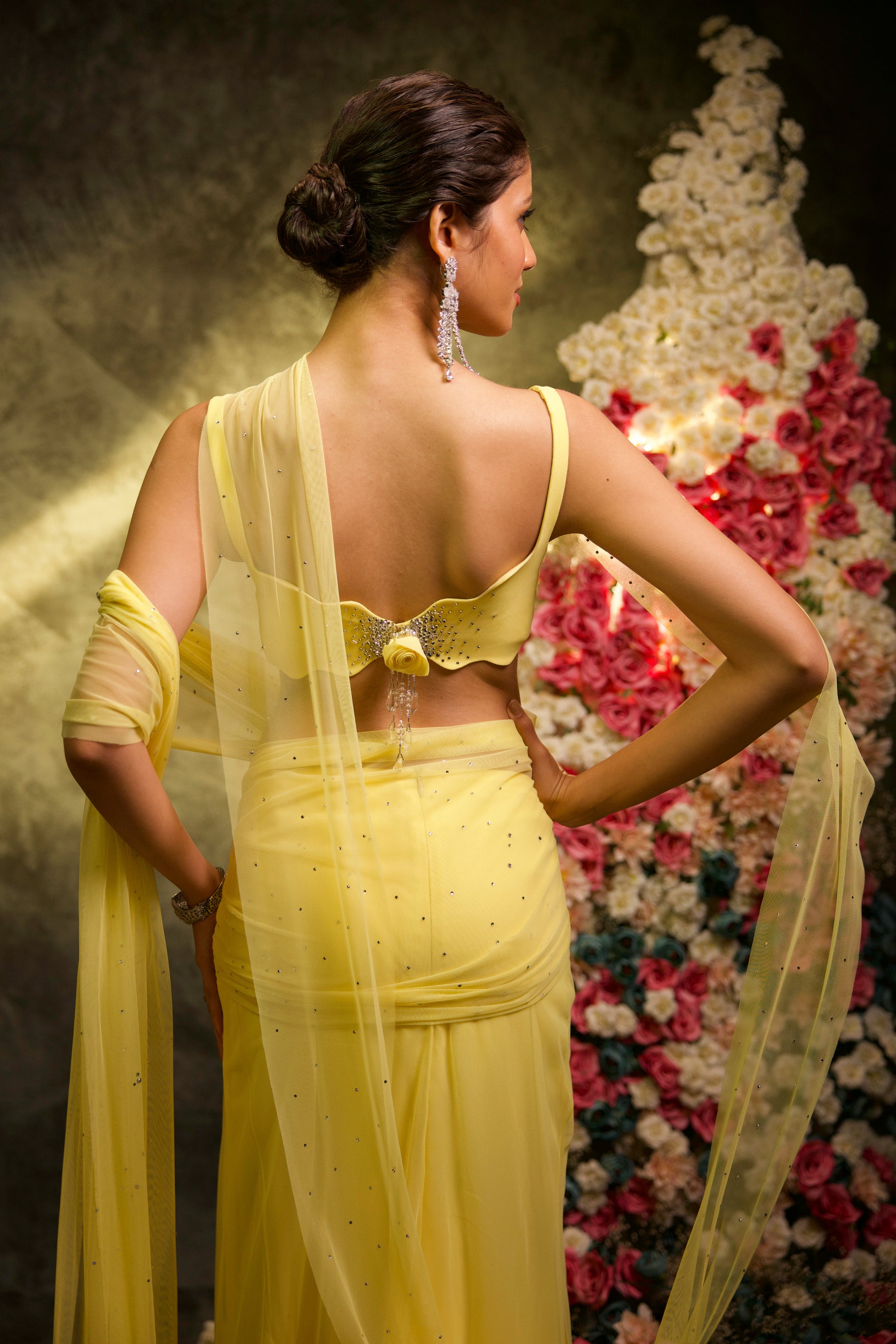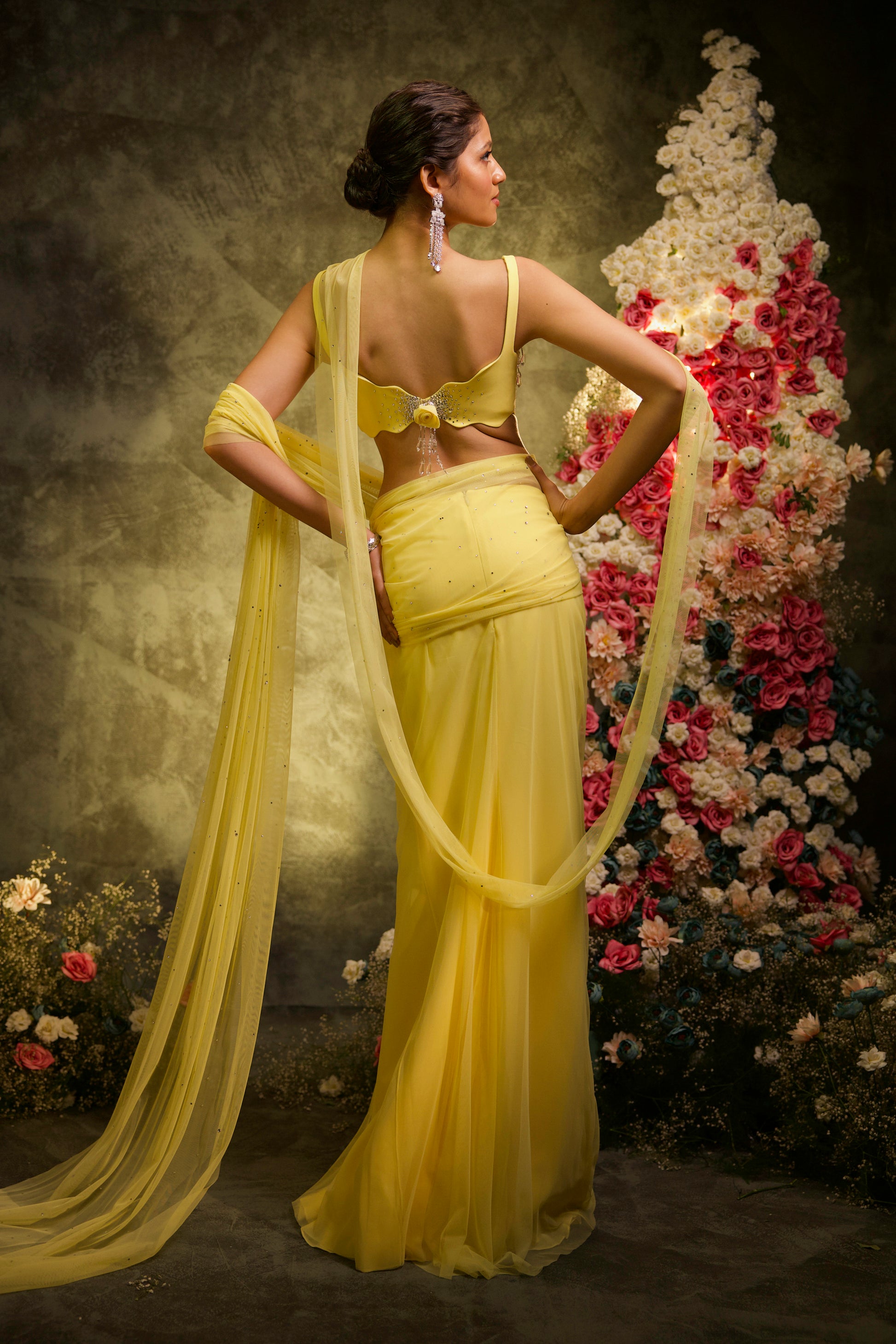 A butter yellow tulle Pre-Stitched saree with a rhinestone-embellished pallu, paired with a sleeveless blouse featuring rhinestone embroidery and the signature Manish Gharat neckline, completed with an attached cape draping from the strap.