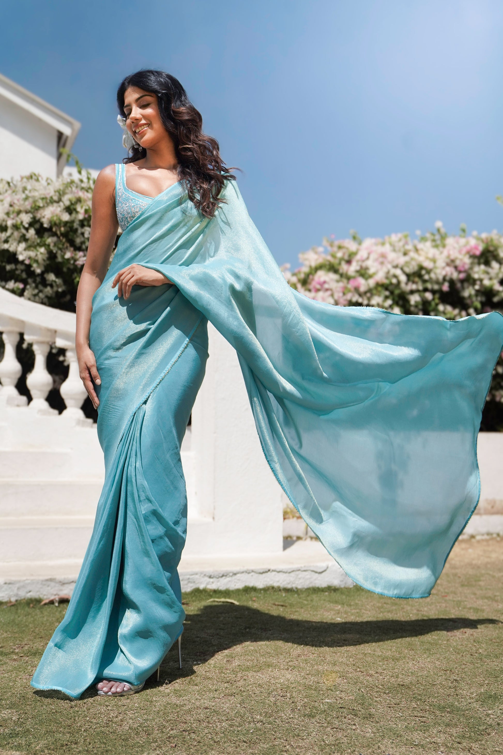 Sky Blue sleeveless blouse with Zari work and mirror embroidery inspired by Jaipur’s City Palace, paired with a tissue silk saree made of natural vegan fabric with a thin blue border.