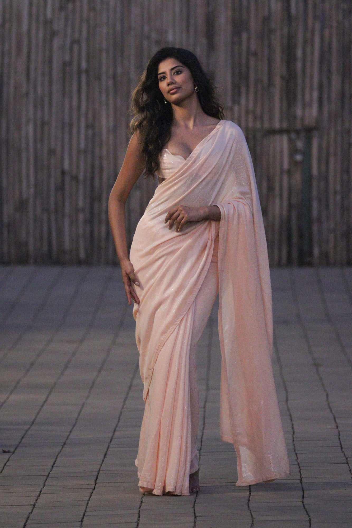 Peach small sequinned saree with a cording border, and a matching blouse piece.
